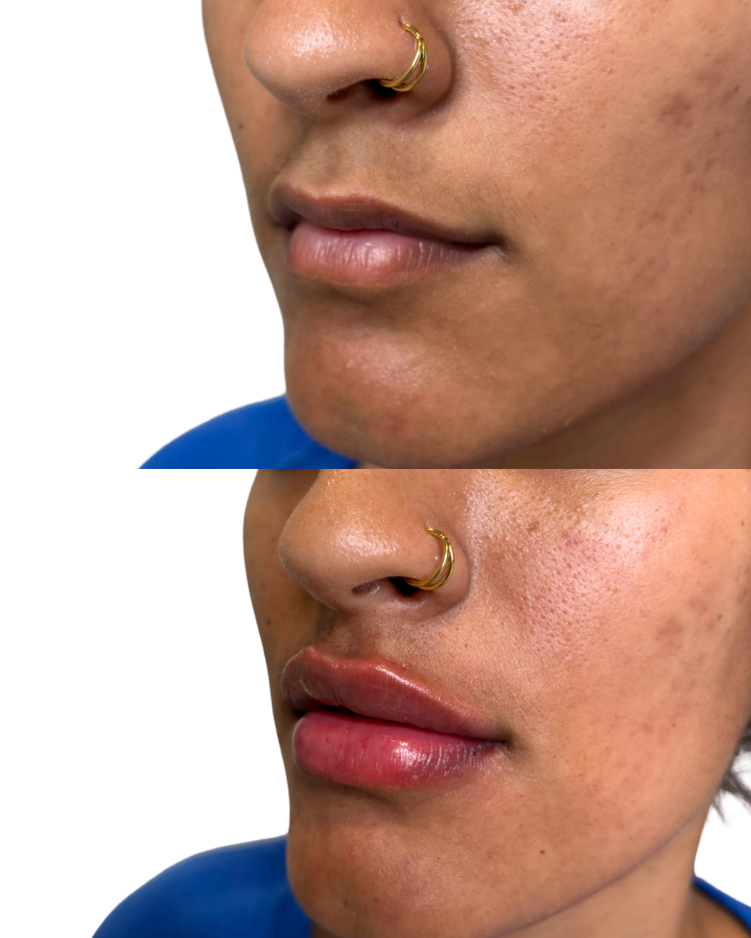 Client was experiencing: Lips that felt flat and lacked definition, wanting a fuller but still natural look. Plan: Lip filler placed to softly enhance shape and add volume while keeping results natural. Timeline: Photos shown immediately after treatment. “It looks so natural, but I finally have the volume I always wanted.”